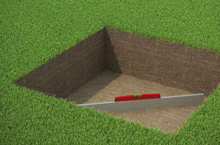 1Tracez au sol, à l’endroit choisi, la forme du bassin. Décaissez le sol (+ 5cm en profondeur et + 10-15cm pour le contour). Ajoutez 5cm de sable en fond de fouille, puis mettez le niveau.
